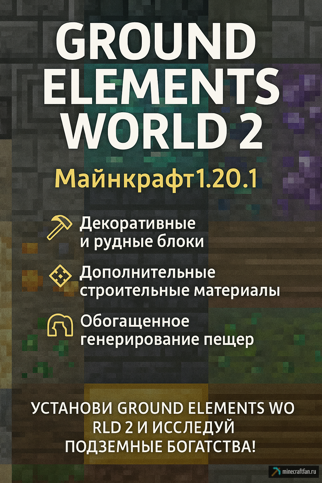 Ground Elements World 2 — мод для Майнкрафт 1.20.1, добавляющий разнообразные блоки, руды и декоративные элементы, обога...