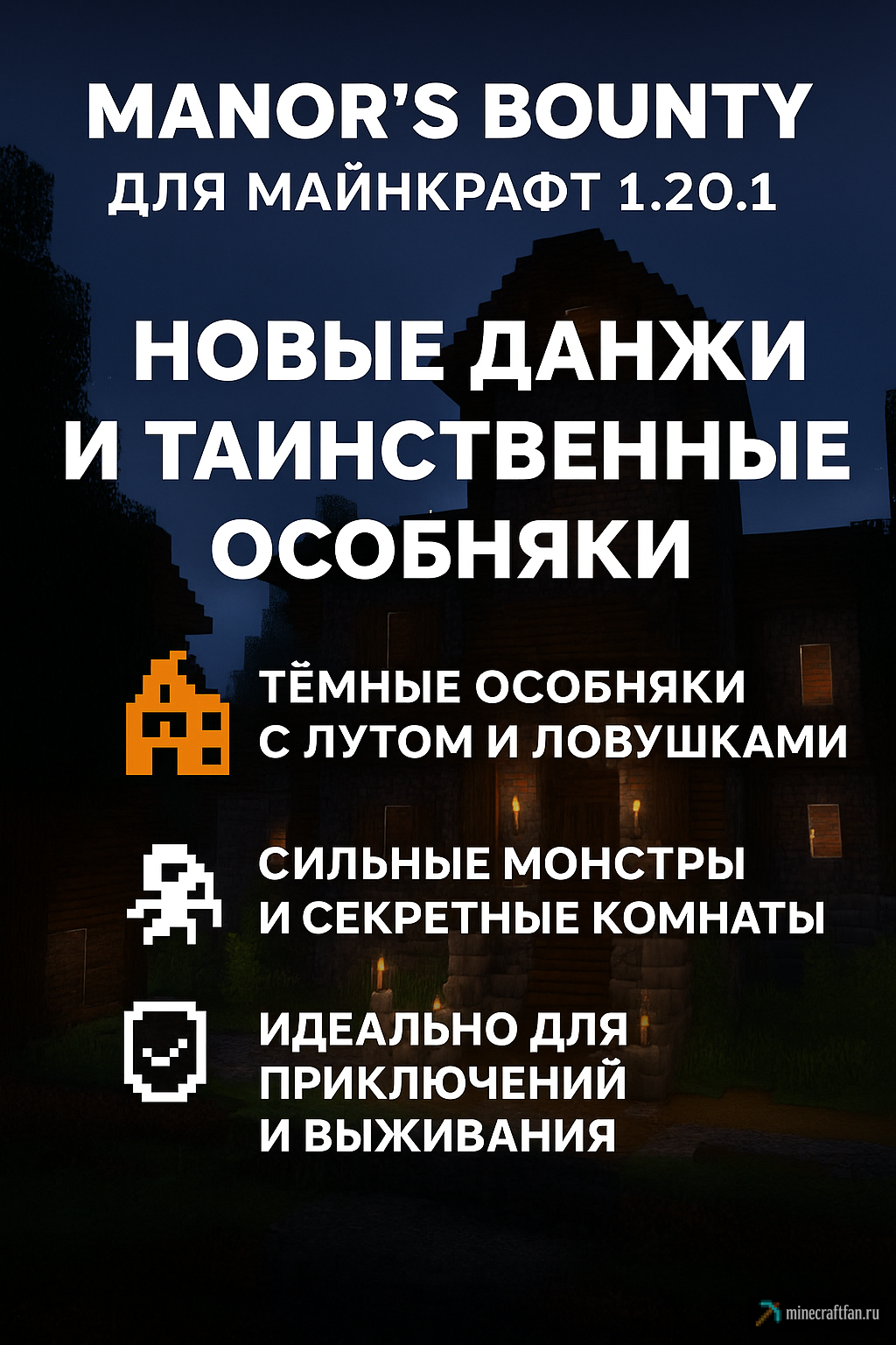 Description: Manor’s Bounty — атмосферный мод, добавляющий в Майнкрафт загадочные особняки, полные лута, ловушек и новых...