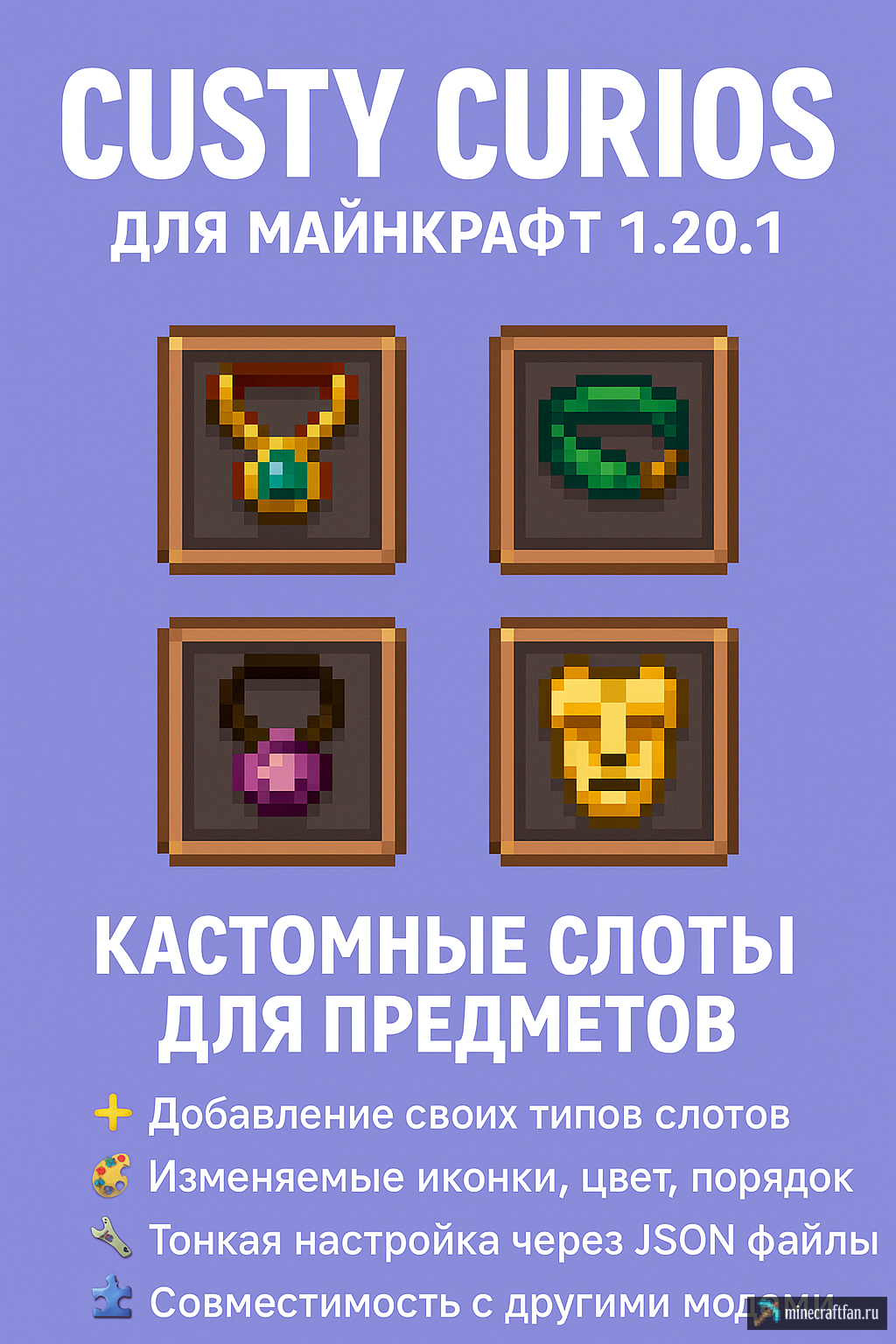 Custy Curios — это мод-аддон для Curios API, позволяющий добавлять свои собственные слоты экипировки. Подходит для модпа...