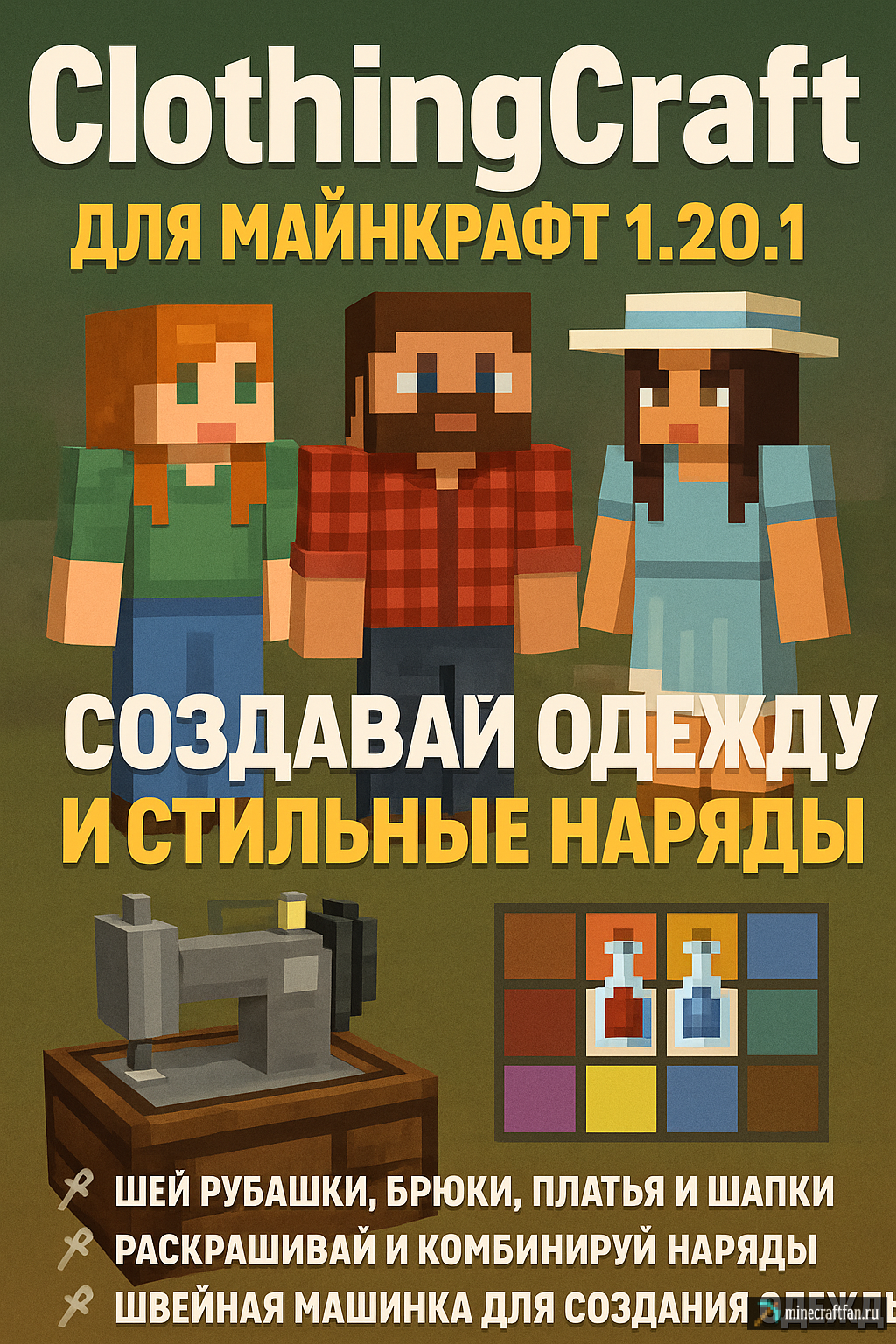 ClothingCraft — мод на кастомную одежду, позволяющий игрокам шить, красить и носить разные костюмы и наряды. Отличный вы...