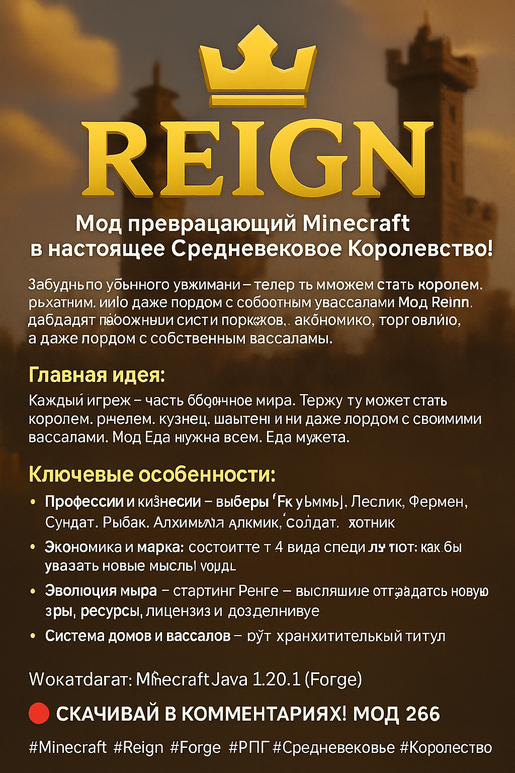 Reign превращает Minecraft в живое средневековое королевство с профессиями, вассалами, экономикой и торговлей. Стань пра...