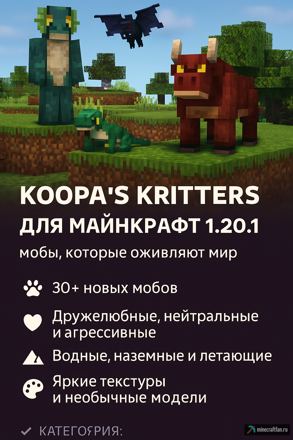 Koopa's Kritters — мод на разнообразных мобов: от милых зверьков до опасных существ. Идеально подходит для обогащения ми...