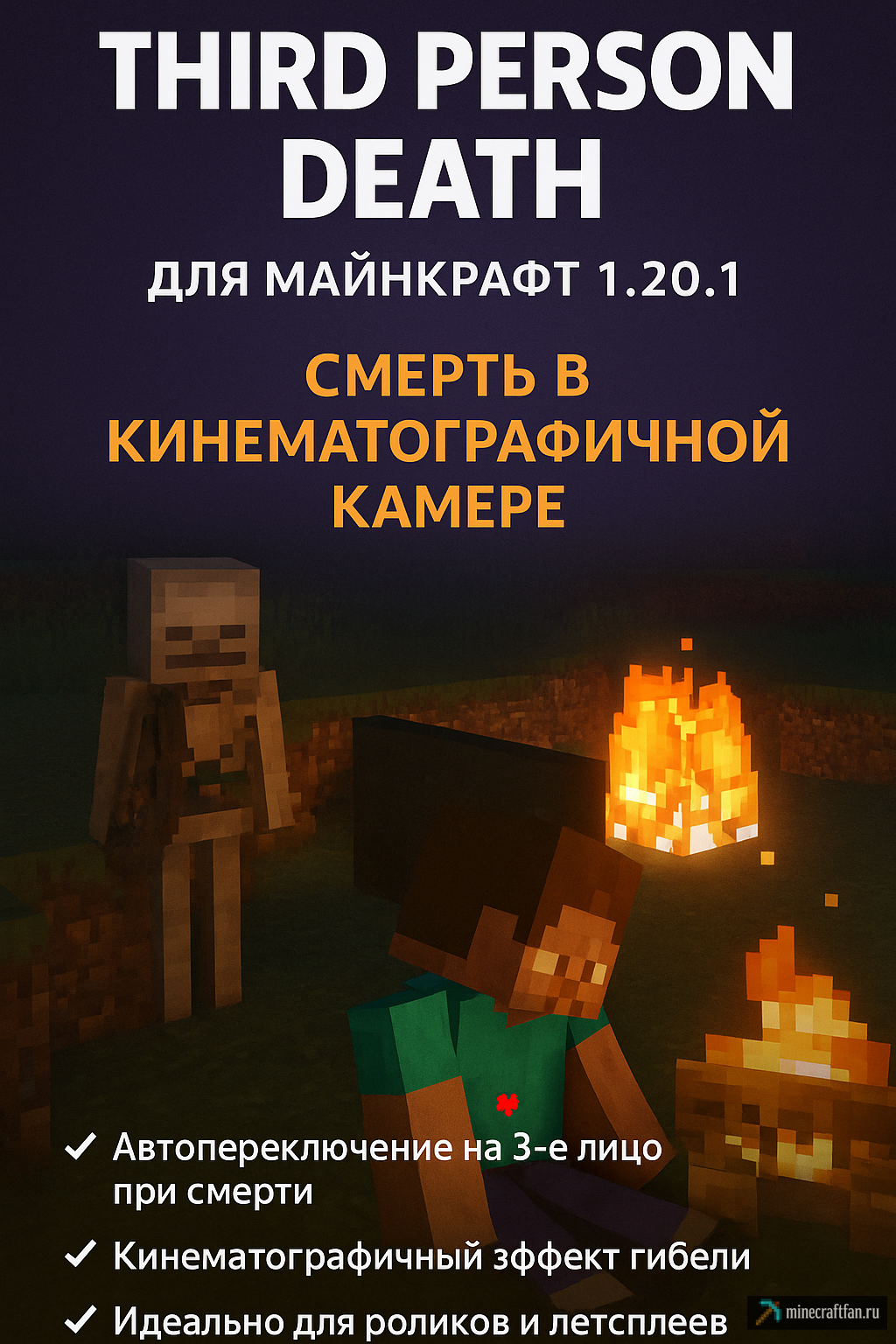 Third Person Death — небольшой мод, который переключает камеру в третье лицо в момент смерти игрока. Подходит для реалис...