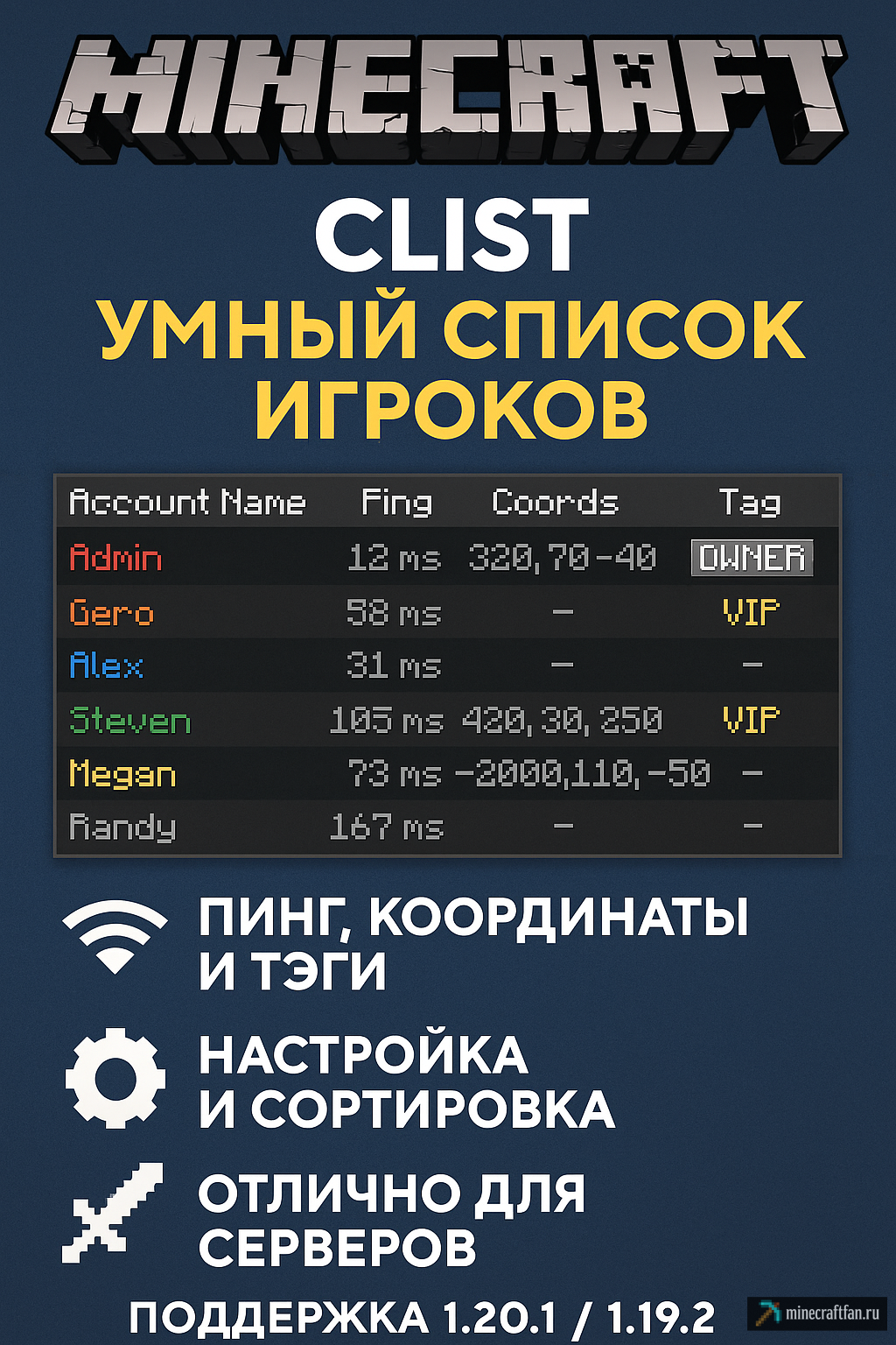 Clist — мод, добавляющий удобный и настраиваемый список игроков на сервере, с возможностью сортировки, отображения пинга...