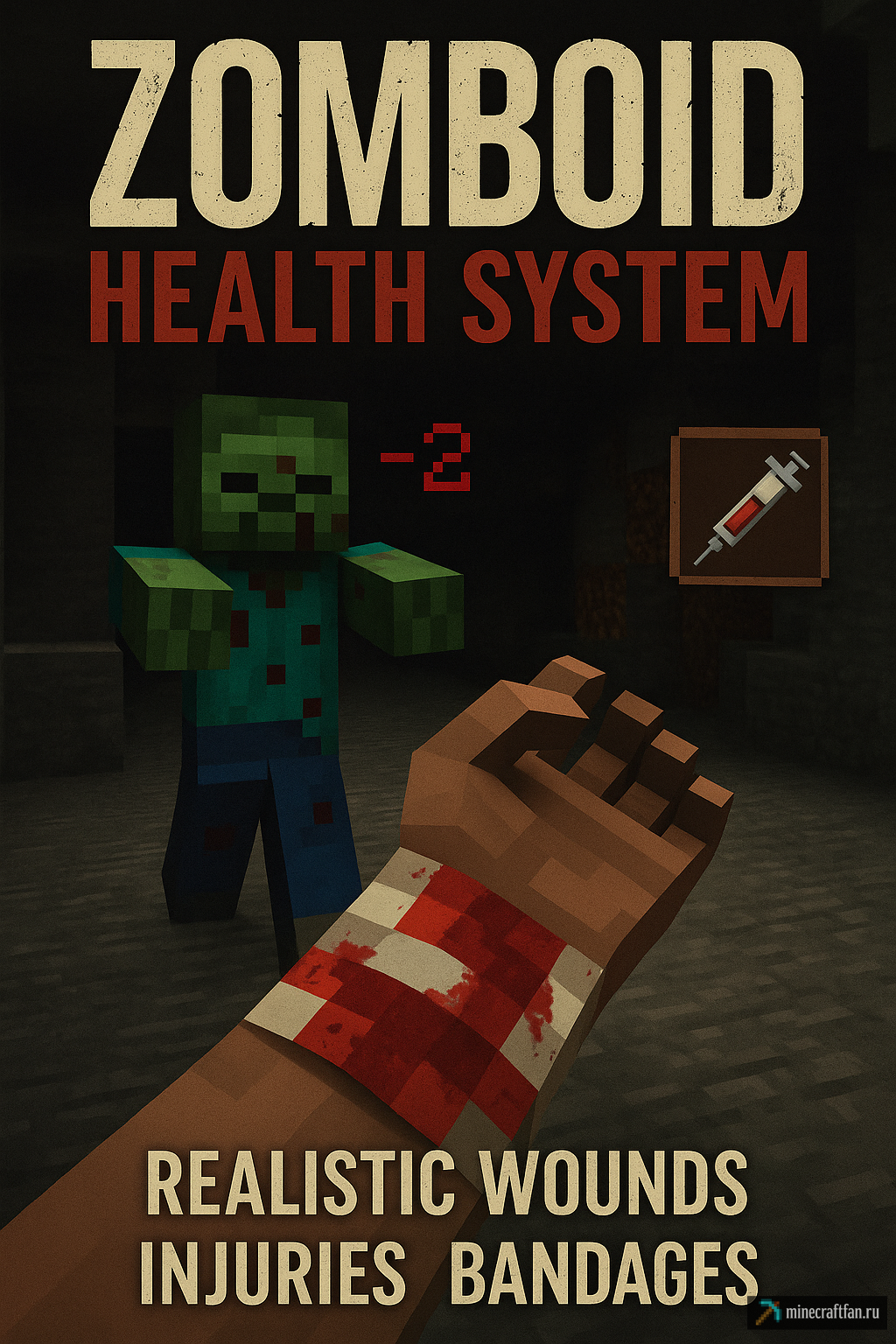 Zomboid Health System — мод для Майнкрафт 1.20.1, добавляющий систему повреждений как в Project Zomboid: кровотечения, п...