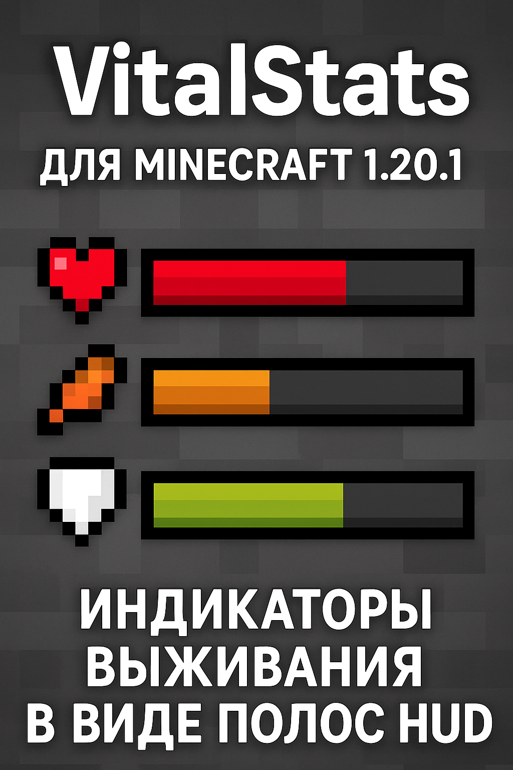 Мод VitalStats для Minecraft 1.20.1 — добавляет визуальные полосы для здоровья, голода, насыщения, брони и опыта. Удобны...