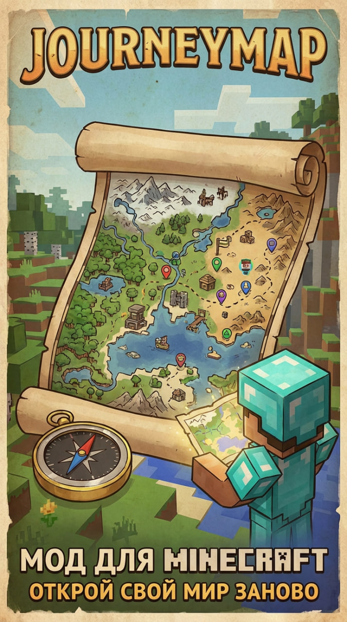 JourneyMap — удобная мини-карта, веб-карта и навигация для Minecraft Java 1.16.5–1.21.10. Метки, пещеры, биомы, мобы и п...