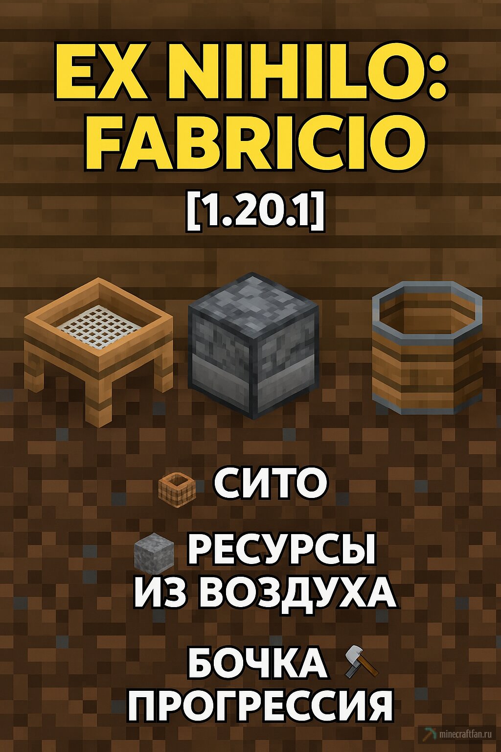 🧱 Скачать мод Ex Nihilo: Fabricio для Minecraft 1.20.1 — сито, ресурсы из воздуха и старт без мира Ex Nihilo: Fabricio...
